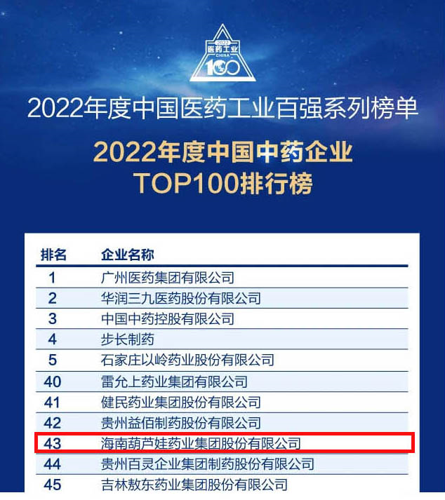 GA黄金甲药业集团连续4年荣登“中国中药企业TOP100排行榜”,排名上升至第43位
